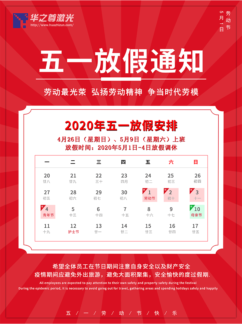 廣州華之尊光電科技有限公司五一放假時間安排:5月1日~4日, 放假調(diào)休共4天,5月5日(周二)、4月26日(周日)、5月9日(周六)正常上班!