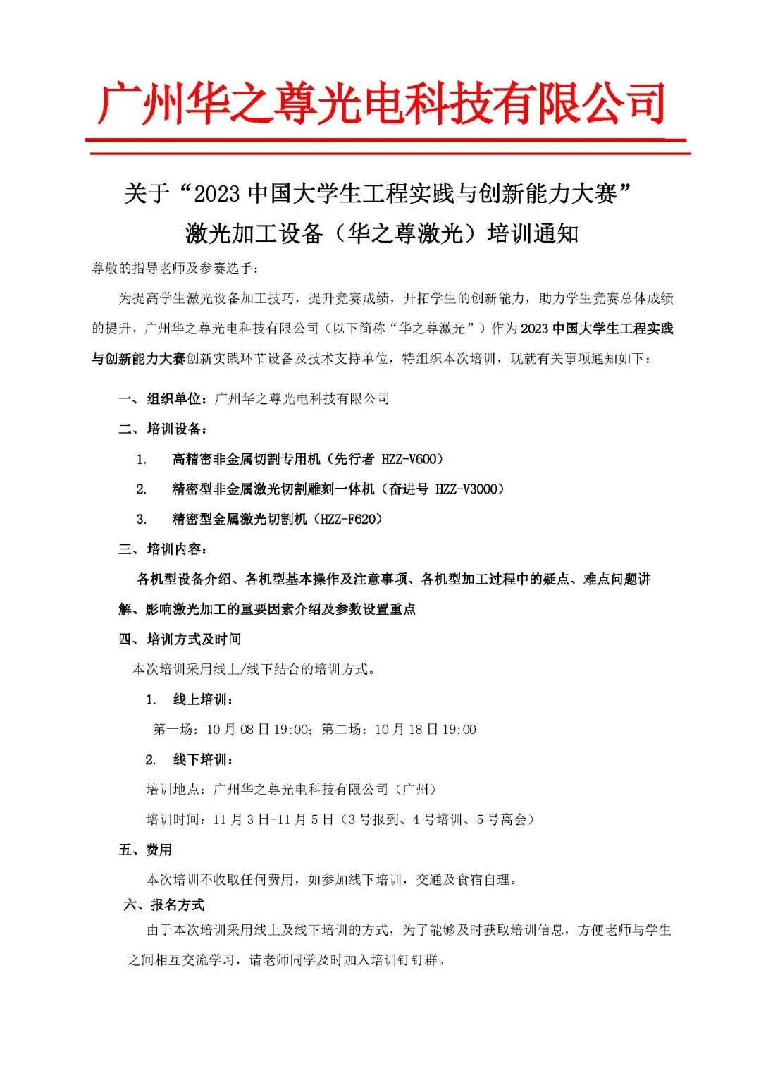為提高學(xué)生激光設(shè)備加工技巧,提升競賽成績,開拓學(xué)生的創(chuàng)新能力,助力學(xué)生競賽總體成績的提升,廣州華之尊光電科技有限公司(以下簡稱“華之尊激光”)作為2023 中國大學(xué)生工程實(shí)踐與創(chuàng)新能力大賽創(chuàng)新實(shí)踐環(huán)節(jié)設(shè)備及技術(shù)支持單位,特組織本次培訓(xùn)。