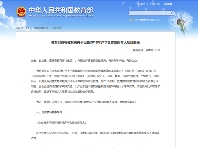 教育部高等教育司關(guān)于公布有關(guān)企業(yè)支持的產(chǎn)學(xué)合作協(xié)同育人項目申報指南(2019年第一批)的通知